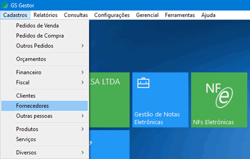 No menu principal, acesse a tela de Cadastro de Fornecedores pelo caminho Cadastros > Fornecedores: