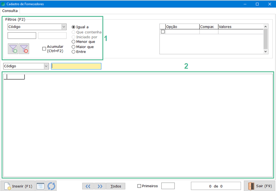 Utilize um ou mais filtros (1) ou apenas clique no espaço da listagem para buscar todos os Fornecedores cadastrados (2).