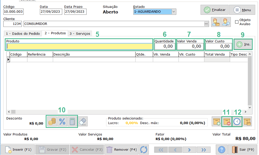 - Desconto: clique em um dos ícones para conceder desconto no produto.